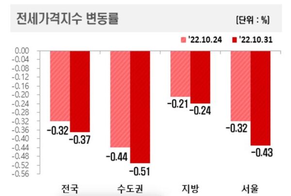 한국부동산원은 10월 다섯째주(31일 기준) 전국 주간 아파트가격 동향을 조사한 결과 서울 아파트 전세 가격은 지난주보다 0.11%포인트 더 떨어진 0.43% 하락을 보였다고 3일 밝혔다. 전국 기준으로는 0.05%포인트 더 떨어진 -0.37%, 수도권은 0.07%포인트 더 떨어진 -0.51%를 보였다.