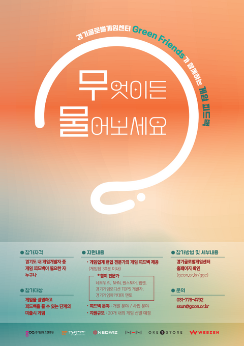 게임에 대한 피드백을 받고 싶은 초기 개발자들에 사전신청을 받았으며, 선발된 12명의 게임 개발자를 현업 전문가와 매칭했다. 컨설팅은 대면 질의응답을 통해 개발과 사업 2개 분야에서 피드백을 제공하는 방식으로 진행된다.