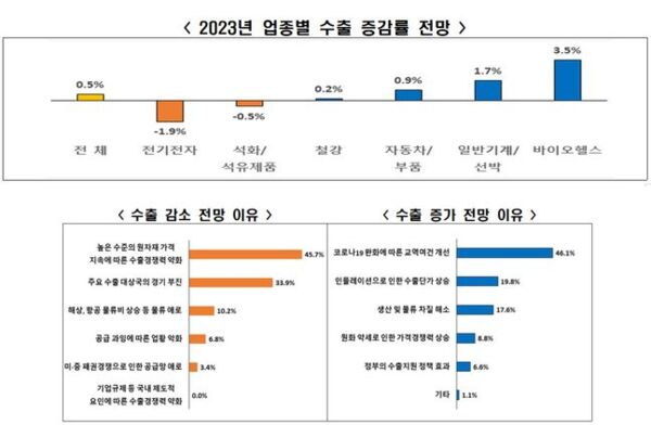 내년 업종별 수출 증가율 전망치를 업종별로 살펴보면, △전기전자(-1.9%) △석유화학・석유제품(-0.5%), △철강(+0.2%) △자동차・자동차부품(0.9%) △일반기계・선박(+1.7%) △바이오헬스(+3.5%) 등이었다.