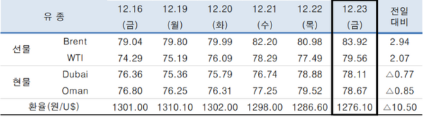 24일 한국석유공사에 따르면 전날 거래된 미국 서부텍사스원유(WTI) 가격은 전일 대비 배럴당 2.07달러 상승한 79.56달러에, 북해산 브렌트(Brent)유는 전일 대비 배럴당 2.94달러 상승한 83.92달러에 마감했다. 중동산 두바이(Dubai)유는 전일 대비 배럴당 0.77달러 하락한 78.11달러에 거래를 마쳤다.