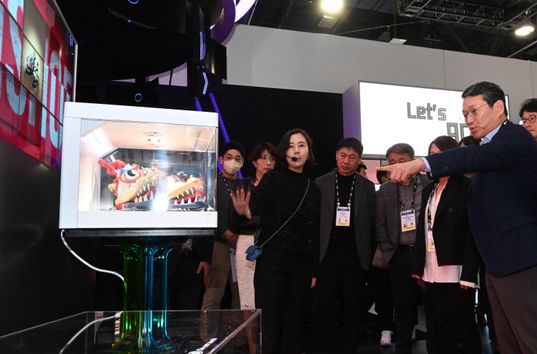 조주완 LG전자 최고경영자(CEO) 사장이 5일(현지시간) 미국 라스베이거스에서 열린 ‘CES 2023’에서 차세대 프리미엄 신발관리 솔루션 ‘LG 스타일러 슈케이스·슈케어’와 NFT(대체불가토큰) 기술로 만든 디지털 가상신발 ‘몬스터 슈즈’로 꾸민 몬슈클(몬스터슈클럽) 전시존을 살펴보고 있다.