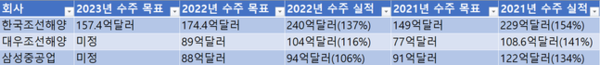 한 조선업계 관계자는 "지난 2022년 조선 시황이 초호황이었기 때문에 올해 수주 시장 규모는 작년보단 줄어들 것으로 보인다"며 "올해 수주 목표를 정하지 않은 대우조선해양과 삼성중공업도 한국조선해양처럼 올해 목표는 비슷하게 낮춰 잡을 것 같다"고 말했다.