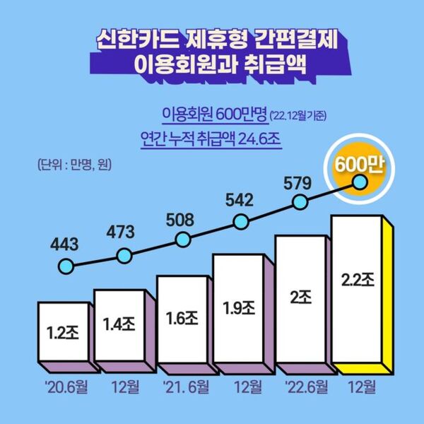 신한카드 간편결제 이용회원은 2020년 12월 한 달간 약 473만명 수준에서 불과 2년만에 30%에 가까운 신장률을 기록하며 600만명을 돌파하는 등 가파른 성장세를 보이고 있다.