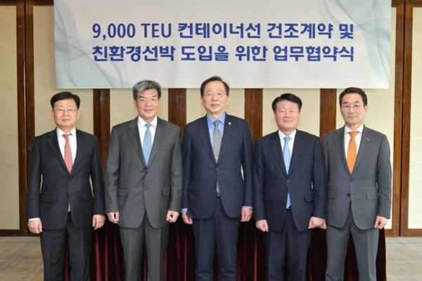 한국조선해양은 14일 웨스틴조선호텔에서 HMM과 1조1000억원 규모의 9000TEU급 메탄올 추진 컨테이너선 7척에 대한 건조계약을 체결했다고 밝혔다.