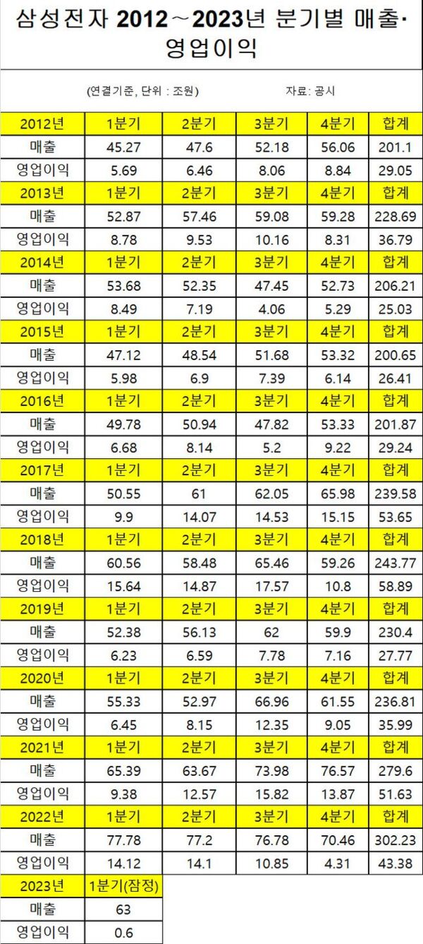 삼성전자 분기 영업이익이 1조원 밑으로 떨어진 건 2009년 1분기 이후 14년 만에 처음이다. 전분기와 비교하면 매출은 10.59%, 영업이익은 86.08% 줄어들었다.