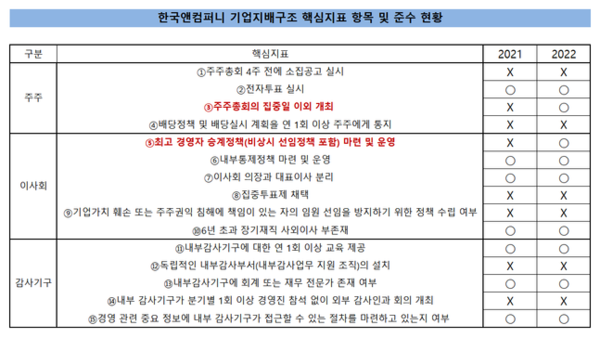 남은 요건인 △집중투표제 채택은 정관에서 집중투표제를 배제했다는 이유로, △기업가치 훼손 또는 주주권익 침해에 책임 있는 자의 임원 선임을 방지하기 위한 정책 수립 여부에 대해선 상법을 기반으로 등기이사 선임 시 자격 검토를 하고 있으나, 미등기임원에 대한 명문화된 규정이 없다는 이유로 충족하지 못했다고 보고했다.