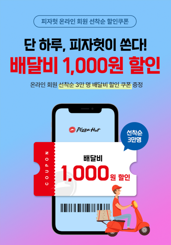 한국피자헛이 16일 단 하루, 자사 온라인 회원 고객 선착순 3만명을 대상으로 배달비 1,000원 할인 프로모션을 진행한다.