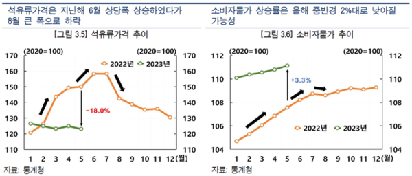 다만 8월 이후에는 소비자물가 상승률이 3%대를 보일 것으로 전망했다. 최 조사국장은 "올해 6~7월은 작년보다 석유류 가격이 크게 하락한것으로 나오지만 8월에는 하락폭이 이전달보다 작다"라며 "다만 구체적인 수치와 관련해서는 불확실성이 크다"고 말했다.