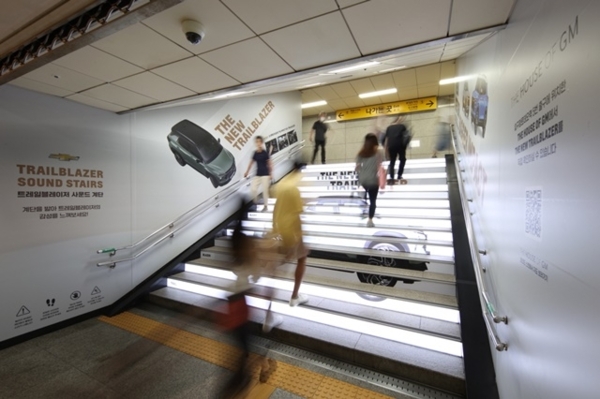 쉐보레는 오는 23일까지 계단을 오르는 발걸음에 따라 감각적인 LED 조명이 켜지고 ‘트레일’, ‘블레이저’, ‘트레일블레이저’로 이어지는 CM송이 재생되며 참가자가 마치 광고의 한순간에 있는 듯한 경험을 느낄 수 있는 ‘트레일블레이저 노래하는 계단’ 인터랙티브 이벤트를 운영한다.
