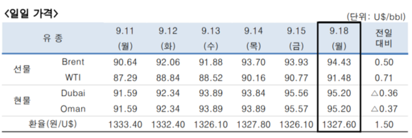 19일 한국석유공사에 따르면 전날 거래된 미국 서부텍사스원유(WTI) 가격은 전일 대비 배럴당 0.71달러 상승한 91.48달러에, 북해산 브렌트(Brent)유는 전일 대비 배럴당 0.50달러 상승한 94.43달러에 마감했다. WTI와 브렌트유 가격 모두 이날 다시 최고치를 경신했다.