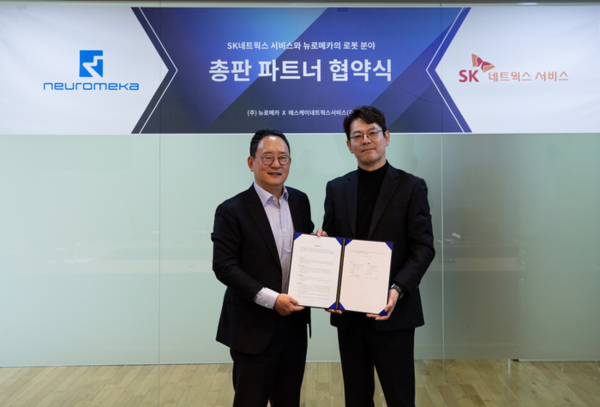 로봇 제조기업 뉴로메카는 전문 서비스, 솔루션 기업 SK네트웍스서비스와 로봇 공급 총판 계약을 체결했다고 12일 밝혔다. 이날 행사는 박종훈 뉴로메카 대표와 최규현 SK네트웍스서비스 본부장이 참석하고 뉴로메카 서울 본사에서 진행됐다.