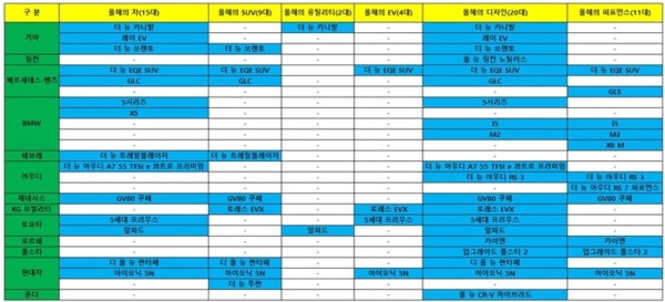 후반기 심사를 통과한 차량은 BMW가 5대로 가장 많았다. 기아와 메르세데스-벤츠, 아우디, 현대차가 각각 3대, 토요타 2대, 링컨, 쉐보레, 제네시스, KG 모빌리티, 포르쉐, 폴스타, 혼다(브랜드명 가나다순)가 1대씩이었다.