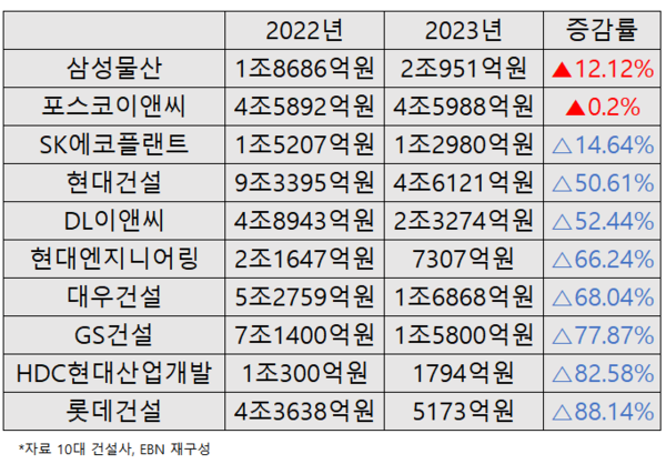 전년 대비 작년 도시정비수주액이 증가한 기업은 10곳 중 단 두곳으로, 삼성물산 건설부문 (12.12%,1조8686억원→2조951억원)과 포스코이앤씨 (0.2%, 4조5892억원→4조5988억원)가 유일하다.
