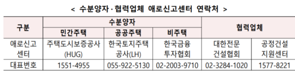 최근 태영건설의 워크아웃 개시 등 PF 시장 불안으로 구조조정을 진행하는 건설사가 증가함에 따라 공사 차질로 인한 입주 지연, 하도급 대금 체불 등의 피해를 최소화하기 위해 애로신고센터를 운영하면서, 피해 신고가 접수될 경우 소관 기관뿐 아니라 기재부, 금융위 등 관계부처 간 협력체계를 기반으로 사업 정상화, 금융지원 등을 최대한 지원할 계획이다.