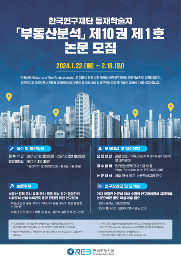 한국부동산원은 부동산 분야의 학술 교류 및 연구 활동 장려를 위해 등재학술지 ‘부동산분석’ 제10권 제1호에 수록할 논문을 내달 18일까지 모집한다고 22일 밝혔다.