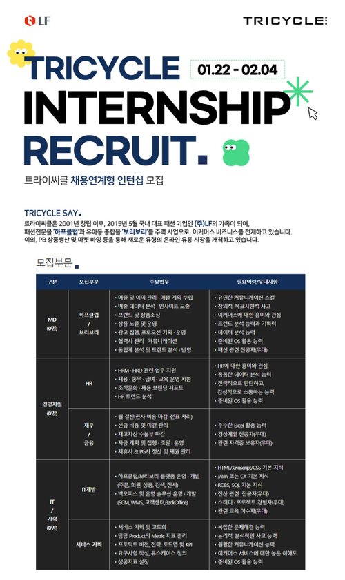 LF 트라이씨클이 채용 연계형 인턴십을 모집한다고 25일 밝혔다.
