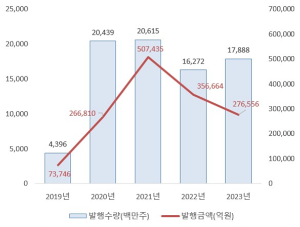 지난해 한국예탁결제원을 통한 주식 발행(전자등록) 규모는 27조6556억원으로 전년 대비 22.5% 감소한 것으로 나타났다.
