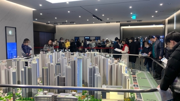 단지 모형도 앞 방문객 30~40명은 모형도를 둘러싼 채 안내원의 설명을 듣고 있었고, 모형도 뒷편에 마련된 전용 59㎡A 유닛 입구 앞엔 40여명이 입장을 기다리고 있었다.