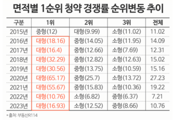 대형 타입은 2015년 중형 타입에 뒤진 후 2016년부터 지난해까지 8년 연속으로 가장 높은 경쟁률을 기록하게 됐다. 이 기간 동안 한 번도 빠짐없이 두 자릿수 경쟁률을 기록한 것은 대형 타입뿐이다.