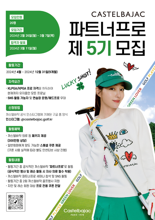 골프웨어 브랜드 까스텔바작이 ‘제5기 파트너프로’를 오는 3월 7일까지 모집한다고 26일 밝혔다. 까스텔바작은 지난 2020년부터 스포츠마케팅 사업의 일환으로 파트너프로를 선발해 활동을 지원하고 있다.