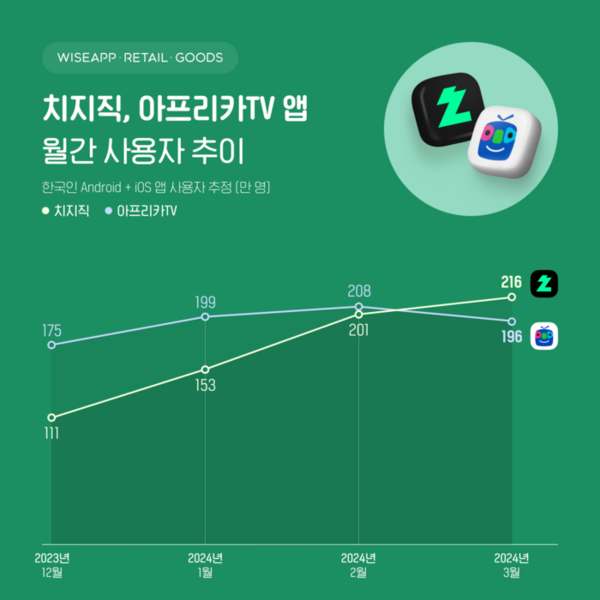 2일 앱·리테일 분석 서비스 와이즈앱·리테일·굿즈에 따르면 지난달 치지직 앱 사용자는 216만명을 기록하며 아프리카TV 앱 사용자 196만명을 넘어섰다.
