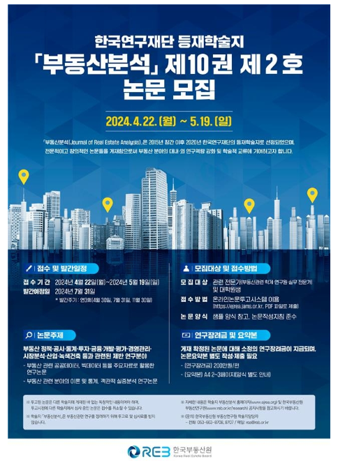 한국부동산원은 부동산 분야의 학술 교류 및 연구 활동 장려를 위해 등재학술지 ‘부동산분석 제10권 제2호’에 수록할 논문을 내달 19일까지 모집한다고 22일 밝혔다.
