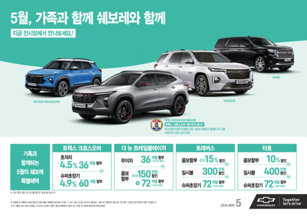 한편, 쉐보레는 5월 1일부터 14일까지 자동차 소모품 무상점검 서비스 등 다양한 혜택을 포함한 ‘2024년 봄맞이 쉐보레 오너케어 서비스’ 캠페인을 실시, 고객서비스를 한층 강화한다. 자세한 사항은 쉐보레 홈페이지에서 확인할 수 있다.
