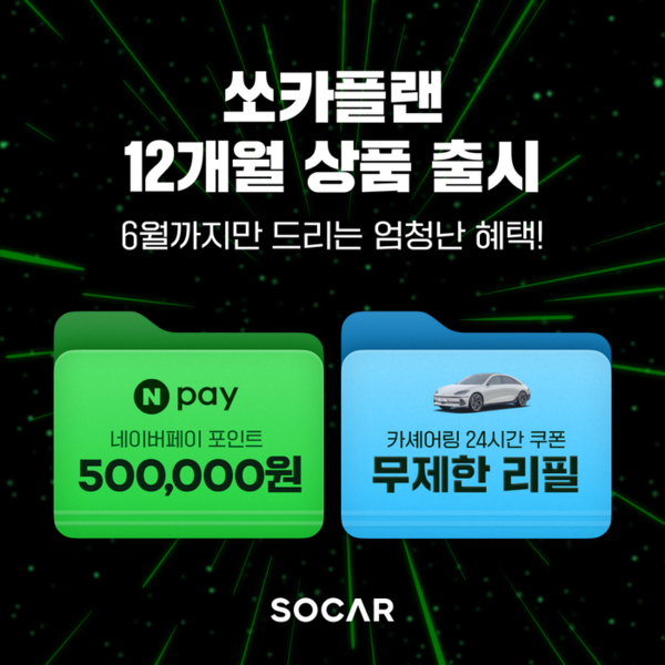 쏘카는 월 단위 카셰어링 서비스인 쏘카플랜에 12개월 기간형 상품을 추가했다고 30일 밝혔다.