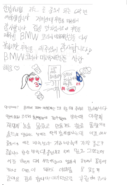 고 사무국장은 “BMW 그룹 코리아가 미래재단 같은 독립적이고 전문적인 사회공헌사업 목적의 비영리 재단을 운영하는 건 BMW 브랜드가 추구하는 지속가능성이 넓고 세부적인 부분에서 고려되고 있다는 것을 잘 보여주는 대목”이라며 “앞으로도 계속 한국의 미래를 짊어질 어린이와 학생을 직·간접적으로 지원하는 다양한 사회공헌 캠페인과 행사를 진행 및 후원할 것”이라고 밝혔다.