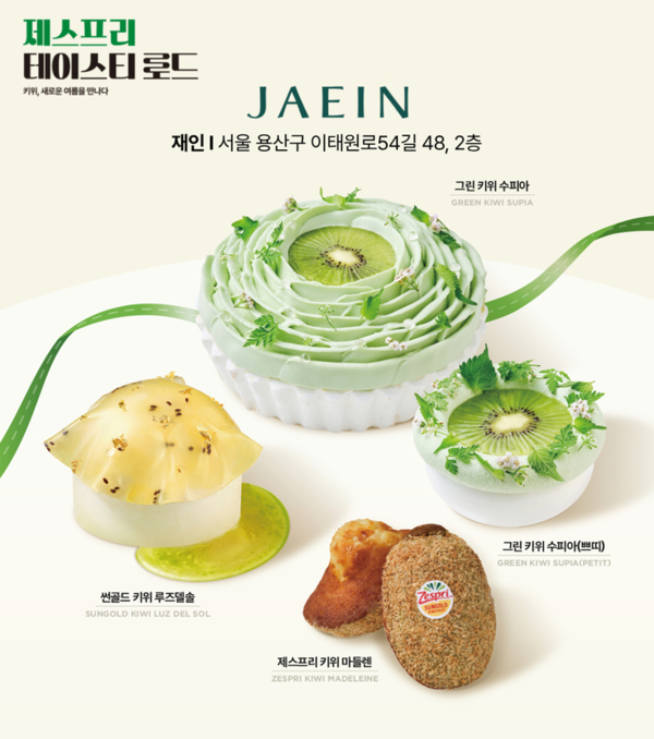 디저트와 칵테일을 함께 즐길 수 있는 ‘힙한’ 디저트바 재인에서는 △그린키위의 상큼함을 담은 그‘린키위 수피아 ’△달콤한 썬골드키위의 화려한 비주얼이 매력적인 썬‘골드키위 루즈델솔’ △썬골드키위를 그대로 형상화한 ‘제스프리 키위 마들렌’ 등 3종의 메뉴를 만날 수 있다. 키위의 상큼달콤한 맛과 각 매장만의 노하우를 더한 이번 콜라보레이션 메뉴는 7월 6일까지 만나볼 수 있다.