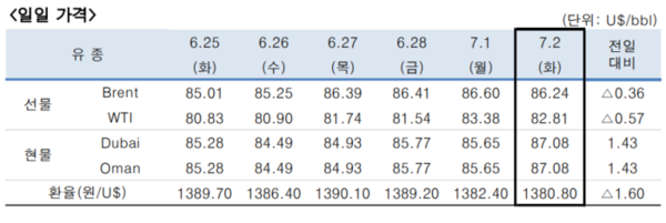 3일 한국석유공사에 따르면 전날 거래된 미국 서부텍사스원유(WTI) 가격은 전일 대비 배럴당 0.57달러 하락한 82.81달러에, 북해산 브렌트(Brent)유는 전일 대비 배럴당 0.36달러 하락한 86.24달러에 마감했다. 중동산 두바이(Dubai)유는 전일 대비 배럴당 1.43달러 상승한 87.08달러에 거래를 마쳤다.