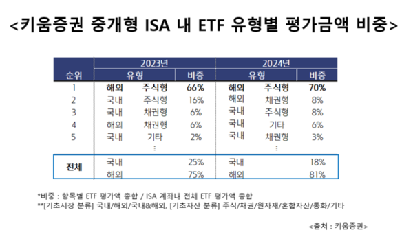 키움증권 중개형 ISA의 ETF 잔고 내에서 국내 상장 해외 ETF가 차지하는 비중은 81%로 전년 대비 6%p 증가했다.