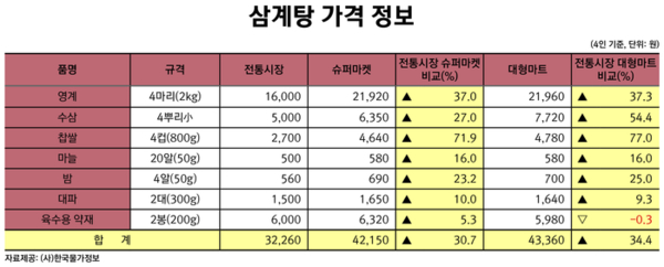 15일 전문가격조사기관인 한국물가정보가 복 시즌을 맞아 전통시장에서 삼계탕(4인 가족 기준) 재료 7개 품목의 가격을 조사한 결과, 3만2260원으로 1인분에 약 8000원이 들어가는 것으로 조사됐다.