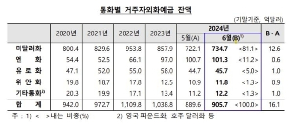 19일 한국은행이 발표한 ‘거주자 외화예금 동향’에 따르면 지난달 말 기준 외국환은행의 거주자 외화예금 잔액은 905억7000만달러로 전월 대비 16억1000만달러 늘었다.