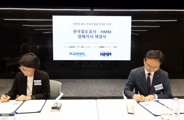 HMM이 한국철도공사(이하 코레일)와 철도수송량 증대와 탄소배출량 감소를 위한 ‘친환경 철도물류 활성화 업무협약(MOU)’를 체결했다고 25일 밝혔다.