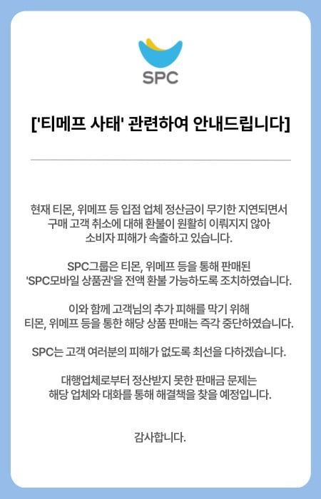 SPC그룹은 25일 보도자료를 내고 “티몬, 위메프 등을 통해 판매된 SPC 모바일상품권을 전액 환불 가능하도록 조치했다”며 “추가 피해를 막기 위해 티몬, 위메프 등을 통한 해당 상품 판매도 즉각 중단했다”고 밝혔다.
