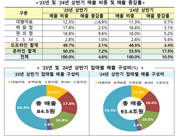 매출 구성 비율을 살펴보면 온라인 매출 비중은 3.2%포인트 증가했지만 오프라인의 대형마트(-1.0%포인트), 백화점(-1.2%포인트), 편의점(-0.8%포인트), 준대규모점포(-0.2%포인트)는 모두 감소했다.