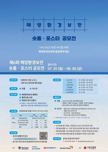 포스코이앤씨는 해양경찰청, 한국전력공사, 월드비전과 함께 해양환경 보전에 대한 관심유도와 공감 문화 조성을 위해 오는 30일까지 ‘제6회 해양환경보전 숏폼·포스터 공모전’을 개최한다고 13일 밝혔다.