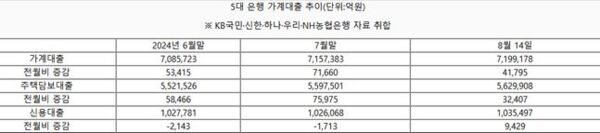 한편 5대 은행(KB국민·신한·하나·우리·NH농협은행)의 가계대출 잔액은 14일 기준 719조9천178억원으로, 이달 들어 채 보름도 지나지 않아 4조1천795억원 더 불었다.