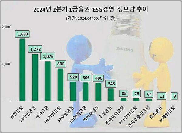 분석 결과 신한은행이 총 1683건의 정보량을 기록하며 2분기 ESG경영 관심도 1위로 나타났다.
