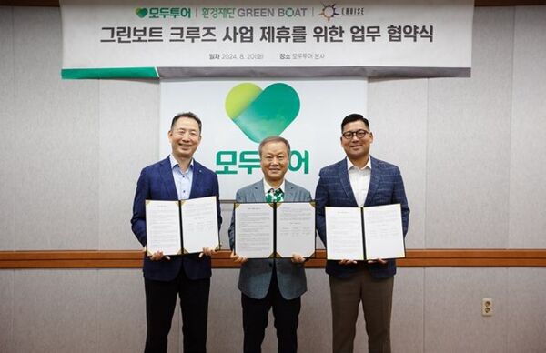모두투어가 지난 20일 환경재단, 크루즈인터내셔널과 함께 '그린보트 크루즈' 상품 판매 활성화를 위한 3자 업무협약(MOU)을 체결했다.