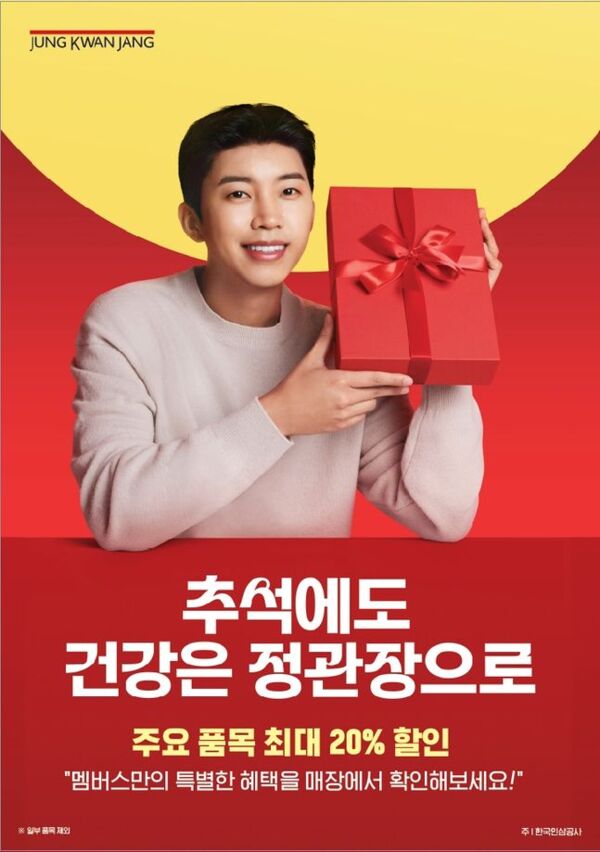 한편, 정관장은 9월 18일까지 '추석에도 건강은 정관장으로' 행사를 진행한다. 가족과 지인에게 선물하기 좋은 '다보록' 선물세트를 비롯하여, '홍삼정', '에브리타임', '홍삼톤', '화애락', '홍천웅', '황진단', '천녹', '활기력', '홍삼달임액' 등 정관장의 대표 스테디셀러와 '장수:율', '기다림 침향', '알엑스진 클린', '버섯달임액', '굿베이스' 등 맞춤형 기능성 및 자연소재를 담아낸 제품에 한해 다양한 구매 혜택을 제공한다. 또한 정관장 멤버스 가입 고객에게는 추가 혜택을 적용하며, '건강 메시지 태그' 및 '황진단 특별 보자기 서비스' 등 굿즈 이벤트도 운영한다.
