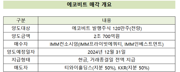 30일 관련 업계에 따르면 태영건설 모회사 티와이홀딩스는 KKR과 50%씩 공동 보유한 에코비트를 IMM컨소시엄(IMM 프라이빗에쿼티, IMM 인베스트먼트)에 전량 매각하는 주식매매계약(SPA)을 체결했다. 매각 대금은 총 2조 700억원이다.