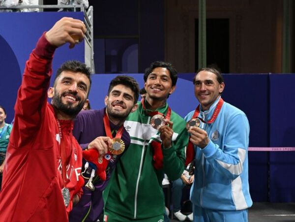 ▶ 8월 30일(현지시간) 프랑스 파리 그랑팔레(Grand Palais)에서 열린 2024 파리 패럴림픽 장애인 태권도 남자 -70kg급(스포츠등급 K44) 공동 취재구역(Mixed Zone)에서 은메달 파티흐 셀릭(Fatih Celik, 튀르키예), 금메달 이마마딘 칼리로프(Imamaddin Khalilov, 아제르바이잔), 동메달 후안 가르시아(Juan Diego Garcia Lopez, 멕시코), 후안 사모라노(Juan Eduardo Samorano, 아르헨티나) 선수가 갤럭시 Z 플립6 올림픽 에디션으로 빅토리 셀피를 찍고 있다. ⓒ삼성전자