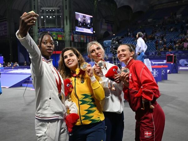 ▶ 8월 30일(현지시간) 프랑스 파리 그랑팔레(Grand Palais)에서 열린 2024 파리 패럴림픽 장애인 태권도 여자 -65kg급(스포츠등급 K44) 공동 취재구역(Mixed Zone)에서 은메달 젤리카 디알로(Djelika Diallo, 프랑스), 금메달 아나 카롤리나 시우바 드 모라(Ana Carolina Silva de Moura, 브라질), 동메달 크리스티나 그켄트주(Christina Gkentzou, 그리스), 리사 게싱(Lisa Kjaer, 덴마크) 선수가 갤럭시 Z 플립6 올림픽 에디션으로 빅토리 셀피를 찍고 있다. ⓒ삼성전자