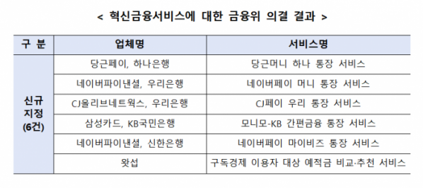 금융위원회는 5일 정례회의를 통해 6건의 혁신금융서비스를 신규로 지정해 총 361건의 서비스가 혁신금융서비스로 지정됐다고 밝혔다.