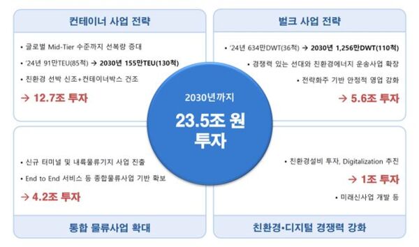 HMM은 글로벌 경쟁력을 강화하고 우리나라 대표 종합물류기업으로 도약하기 위해 2030년까지 23조5000억원을 투자한다. 컨테이너 운송사업에 더해 벌크 운송사업 및 통합 물류사업 영역을 확장해 안정적인 사업 포트폴리오를 갖추고 선진적인 ESG경영 체제를 구축할 계획이다.