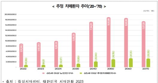 급격한 고령화는 암과 같은 질병의 발생도 증가시키고 있다. 치매 또한 노후에 피해가기 쉽지 않은 질병이다. 치매환자 1인당 연간 관리비용은 2010년 1851만원에서 2022년 약 2220만원으로 약 19.9% 증가한 것으로 추정되며 일반 가구보다 노인부부 가구의 월평균 소득이 낮아 상대적인 경제적 부담은 더 크게 다가올 것으로 보인다.