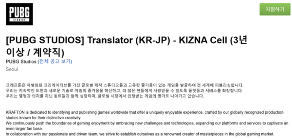 11일 게임업계에 따르면, 크래프톤은 최근 2D 서브컬처 게임 ‘프로젝트 C3’ 개발을 위한 인력 채용에 나섰다. 해당 채용 공고에서 ‘프로젝트 C3’의 개발 조직 이름은 ‘KIZNA Cell’로 소개됐다.