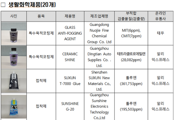 이 중 69개 제품(생활화학제품 20개, 금속장신구 49개)이 ‘생활화학제품 및 살생물제의 안전관리에 관한 법률’, '화학물질등록평가법‘ 등 국내 안전기준에 적합하지 않은 것으로 확인됐다.
